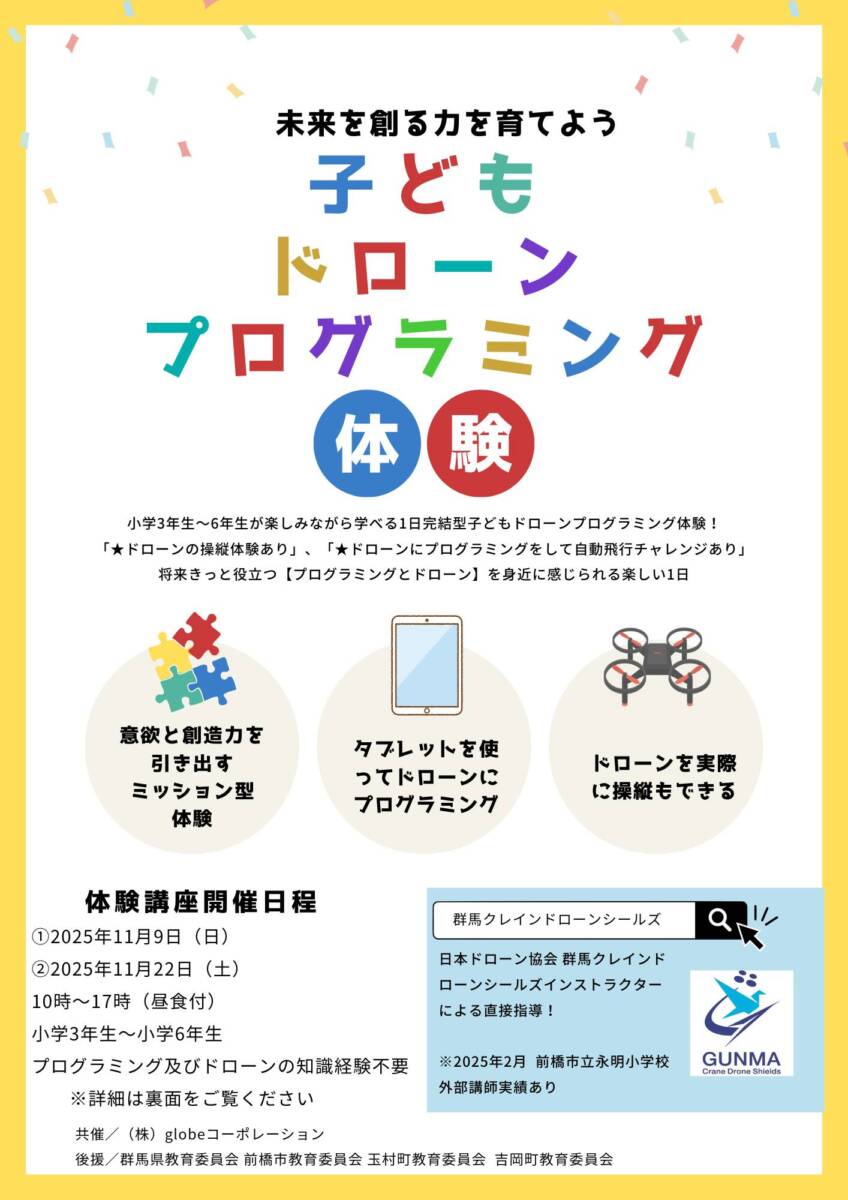 株式会社globeコーポレーションとの共催で小学3年生~6年生を対象に楽しみながら学べる1日完結型の「子どもドローン&プログラミング体験講座」を開催します。(昨年も大好評、定員で募集を打ち切らせていただいた当企画、夏の暑さが昨年はあまりにも厳しかったため、秋に時期を変えての実施となります)