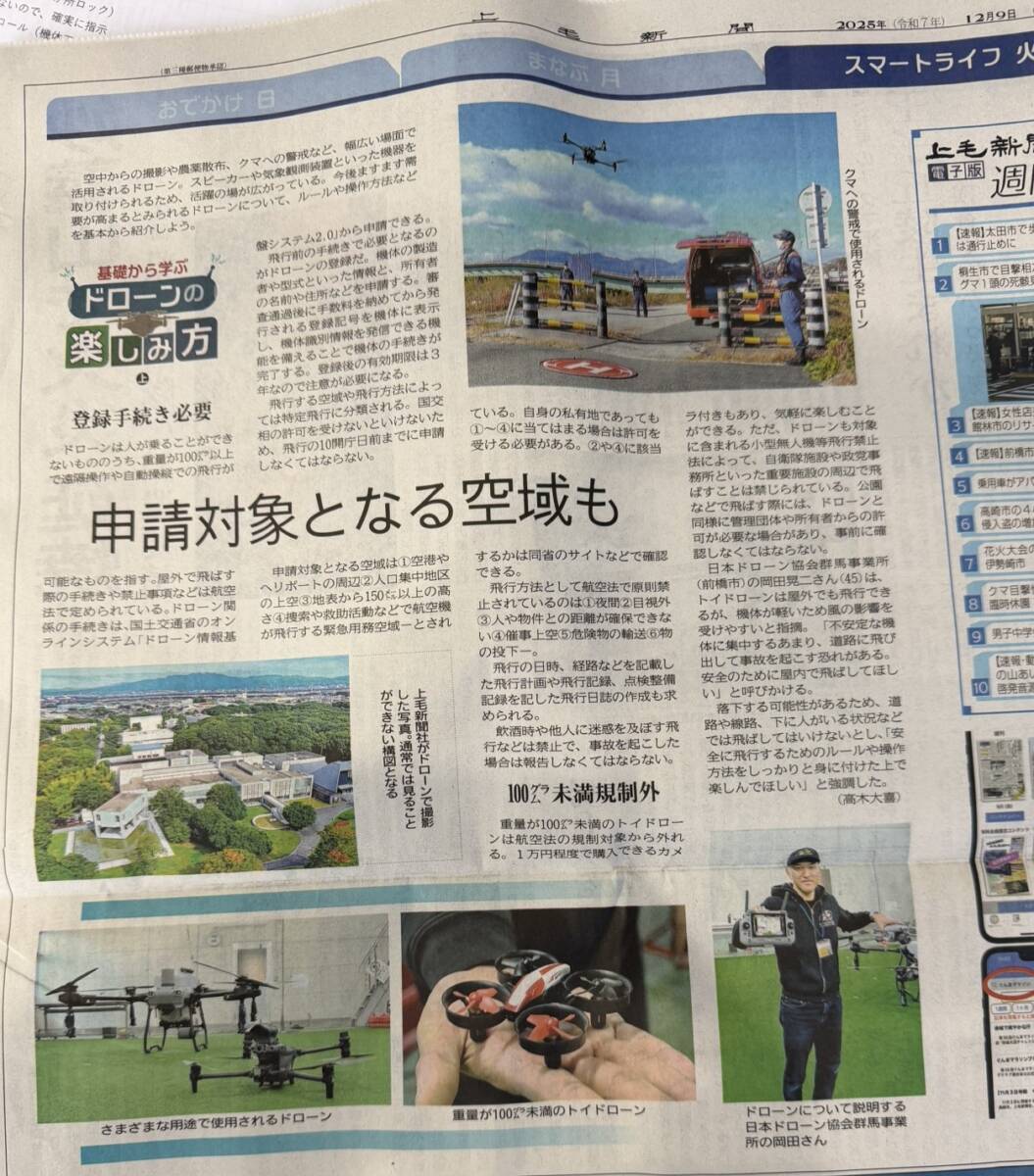 2025年12月9日上毛新聞に掲載された「基礎から学ぶドローンの楽しみ方」の記事監修を行いました!法律・規制に関わる内容のため、ドローンに関心がある方々が安全に正しくドローンを飛行させる一助となっていれば幸いです!
